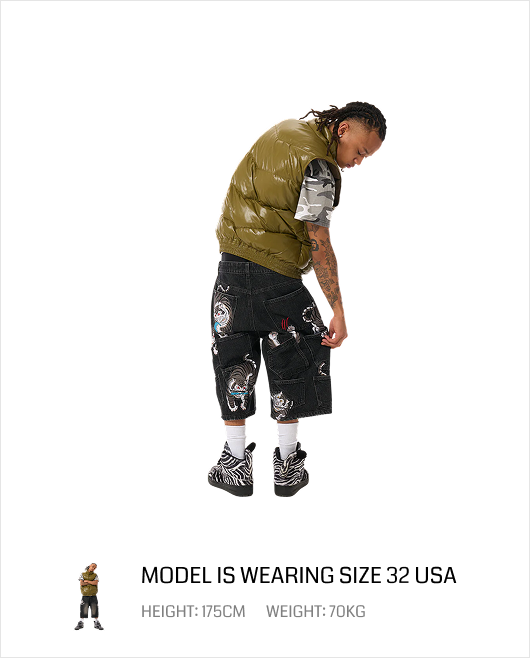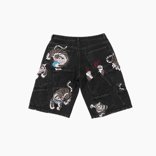 Questi jordan presentano un ricamo a mano di una tigre (tora) con un'accurata lavorazione in filo bianco e grigio, che crea profondità e ombre solo attraverso le cuciture. Le tigri ricamate mantengono la loro personalità feroce sullo sfondo neutro del denim grigio.