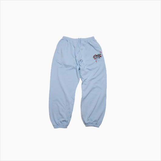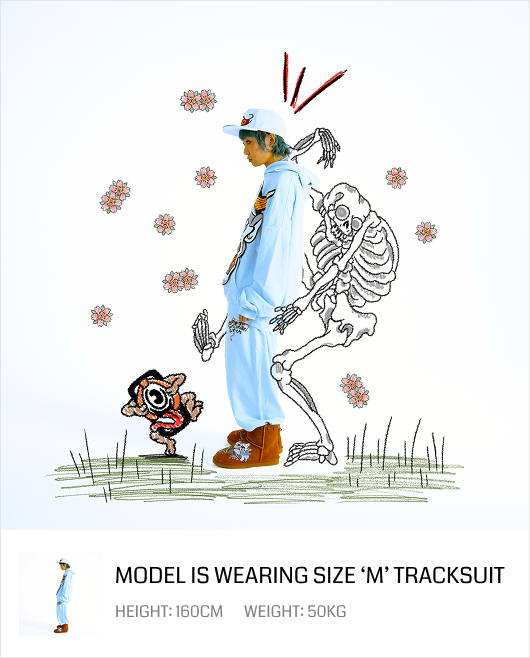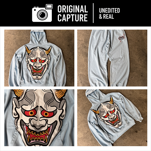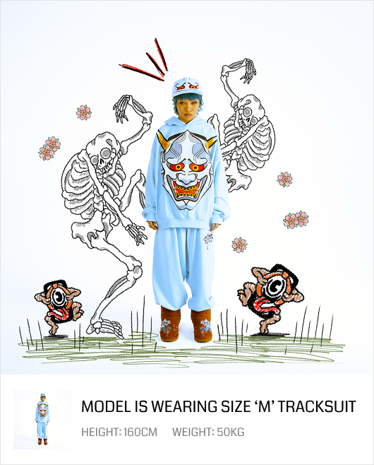 This light blue washed denim set features an eye-catching Oni artwork design on the hoodie front. It delivers a soft interior feel with a structured drape that keeps its shape.