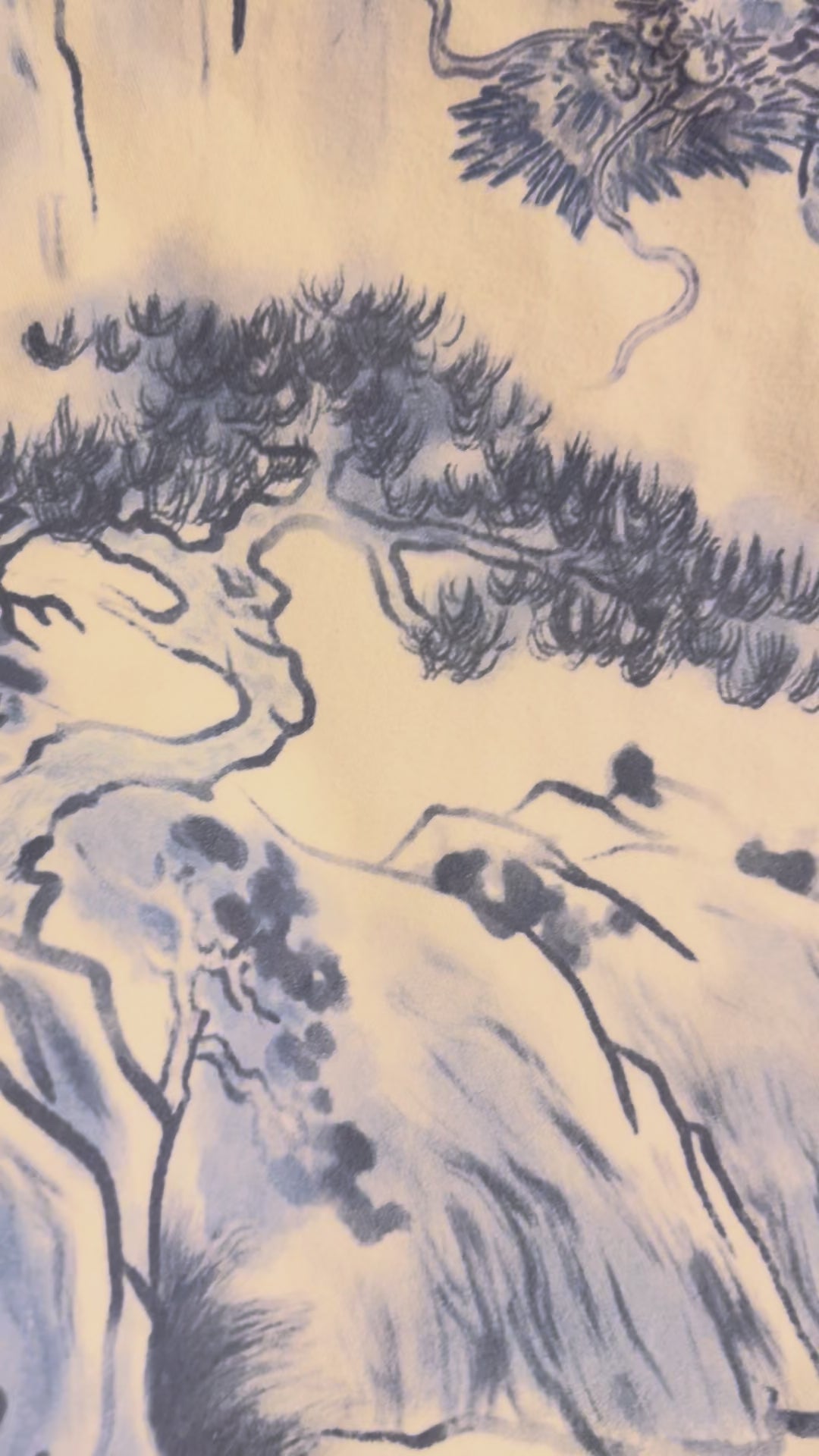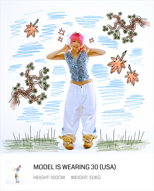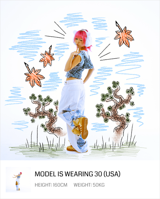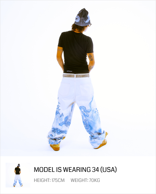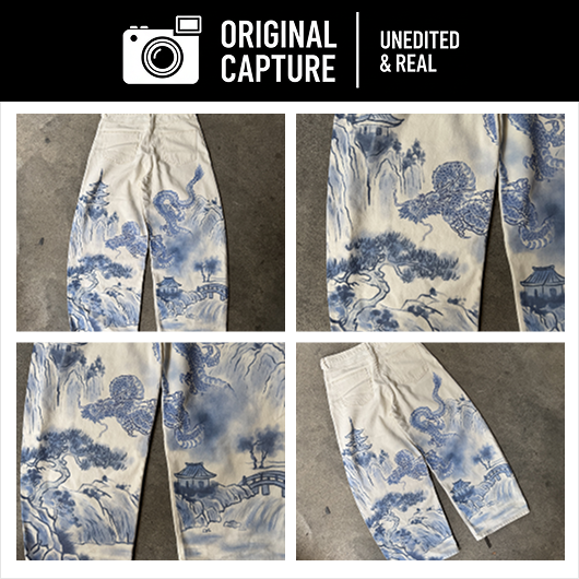 Inspired by traditional Tobe-yaki pottery, these jeans feature delicate blue-ink reminiscent of porcelain art. It features mountains, foliage, and atmospheric elements. The aesthetic creates a wearable art piece that tells a story with every glance.